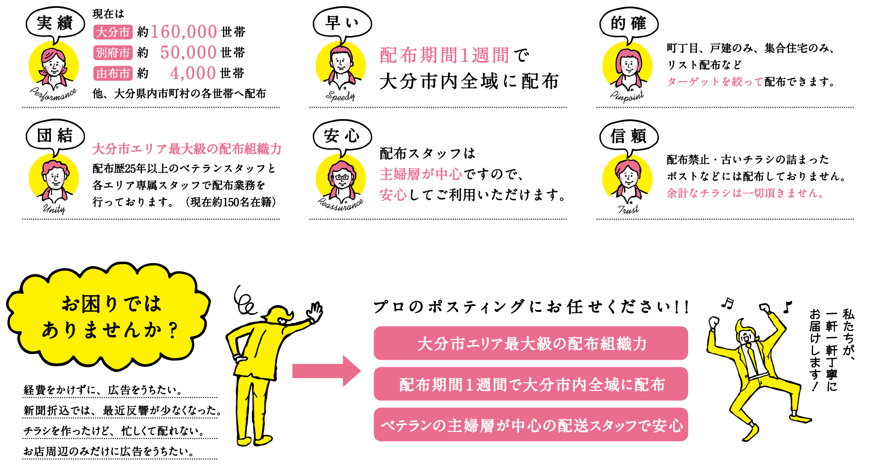 弊社は昭和61年より、大分市・別府市にて一般家庭への月刊誌・チラシ・サンプル等のポスティング業務を行っております。