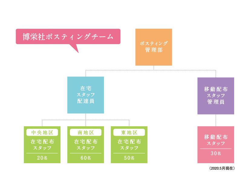 弊社では、ポスティング歴25年以上のベテラン専任スタッフ約30名と各地域の在宅スタッフ約150名で、日々変わる世帯数・配布可能数の集計管理、各地域にモニターを配置しての配布調査を行ない「一枚一枚を丁寧に」の初心を忘れず誠実なポスティング体制を整えております。